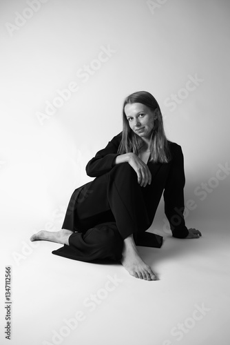 Black and white photo of young fantastic model. Studio. European type. White background. Emotional. Minimalist and stylish. Fashion shot of stylish vogue woman in black suit sitting on floor in studio