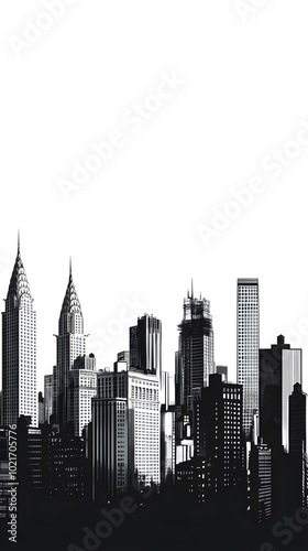 Black and white vector illustration of the New York City skyline, on a white background, with a minimalistic design featuring clean lines and a simple drawing style