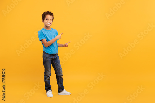 Black boy in blue t-shirt pointing right at free space and smiling at camera, yellow setting