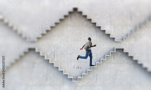 Black businessman climbing stone stairs illustrating career development and success concept. Mixed media
