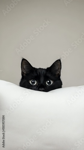 black, cat, peeking, pillow, white, cute, pet, felino, eye, curious, soft, indoor, animal, fluffy, looking, hide, surprise, expression, curiosity, cosy, playful, home, fabric, face, head, background, photo, domestic, relaxed, adorable, whisker, gaze, observing, serene, minimalist, charming, small, creature, couch, sitting, bed, resting, warmth, joy, beauty