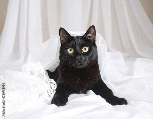 cat, black, white, fabric, under, yellow, eye, lying, animal, cute, soft, studio, photo, pet, closeup, adorable, playful, hiding, domestic, still, image, portrait, fluffy, peaceful