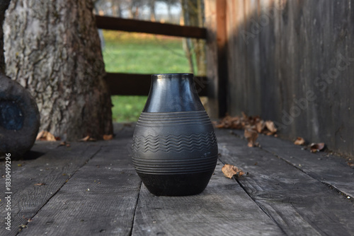 black, ceramic, vase, pottery, jug, hand-made, earthenware, traditional, folk art, rustic, vintage, antique, display, wooden table, outdoors, garden, backyard, nature, sunlight, shadow, still life, home decor, artisan, craft, simple, cosy, stylish, contrast, pattern, design, beverage, country life, farmhouse, charming, exterior, building, wall, light, warm, autumn, fall
