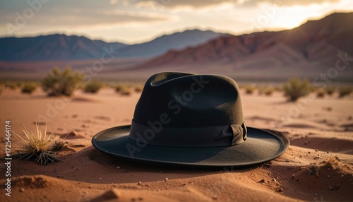 hat, cowboy, black, desert, sand, dune, sunset, gold, light, sky, cloud, orange, pink, blue, landscape, horizon, solitude, mystery, western, drama, atmosphere, texture, natural, scene, object, placement, contrast, visual, composition, highlight, background, isolated, stylish, cinematic, earthy, sharpened, storytelling, photo, symbolic