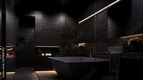 black, dark, bathroom, illustration, modern, sleek, tile, minimalist, design, light, ceiling, fixture, dramatic, shadow, wall, floor, background, contemporary, elegant, moody, sophisticated, luxury, stylish, monochrome, ambience, chic, refined, polished, atmospheric, serene