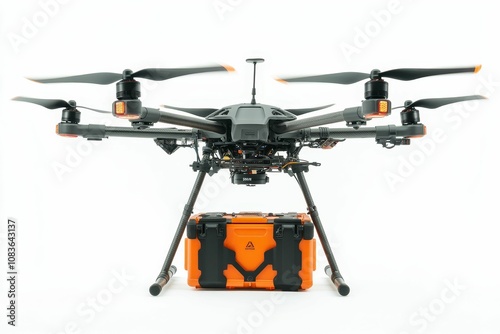 Black drone with orange case on white background.