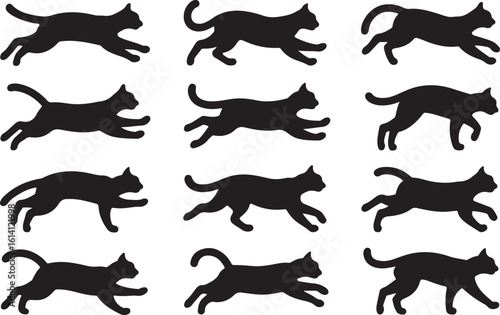 black, felino, silhouette, animal, running, jumping, movement, grace, elegance, domestic, pet, mammal, creature, illustration, graphic, design, pattern, repetition, white, background, simple, clean, dynamic, energetic, playful, agile, swift, quick, active, motion, sequence, series, collection, set, art, vector