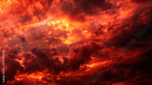 Black Fiery Red Dramatic Sky with Clouds, Wide Bloody Red Background, Intense Cloudy Sunset, Fiery Atmospheric Scene, Dramatic Sky Colors, Vibrant Red and Black Sky, Moody and Eerie Background, Fiery