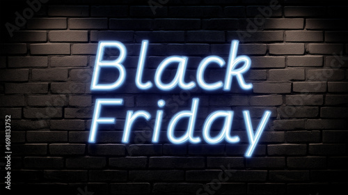 Black Friday Neon Sign: A captivating illuminated neon sign spells out Black Friday against a textured dark brick wall background, with glowing letters, evokes the anticipation of a shopping event.