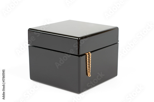 box, black, glossy, chain, gold, gloss, jewellery, jewellery, plastic, wood, wooden, small, isolated on white, white background, case, container, closed, package, gift, pack, surprise, board, 1, trunk, cover, lid, deliver, rectangular, square, new, object, one object, single, single object, closeup, macro