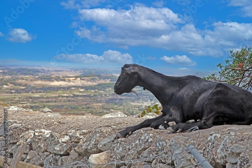 Black goat relaxing with panoramic countryside views in Mallorca