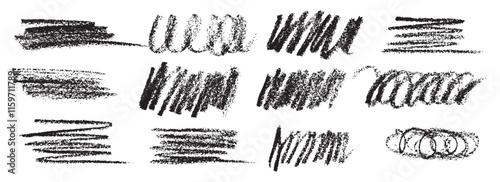 Black Hand-drawn Charcoal scribbles, Grunge pen crayon pencil collection, squiggles and shapes hand drawn . pencil lines and doodles vector, Vector illustration.