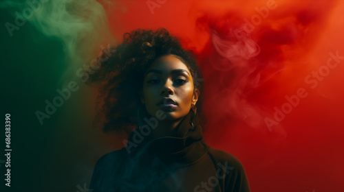 Black History Month. African American History in United States. Red Yellow Green smoke shrouded black woman. Freedom holiday. Celebrated annual in February. Poster, design art illustration. Generated