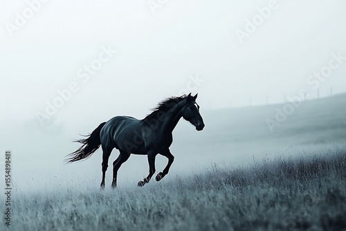 horse, black horse, galloping, running, field, mist, fog, equine, animal, mammal, nature, outdoors, freedom, power, strength, motion, movement, landscape, rural, countryside, grass, pasture, wildlife, farm, one animal, dark, silhouette, foggy, atmospheric, moody, serene, peaceful, quiet, tranquil, elegance, graceful, beautiful, majestic, equestrian, full body, half face, monochrome, dreamy, aethereal