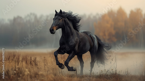black horse, horse, fast horse, equine, animal, nature, outdoors, running, galloping, motion, movement, power, speed, field, grass, fog, mist, autumn, fall, tree, landscape, daylight, equestrian, advertising, marketing, banner, website, editorial, freedom, wild, strength, energy, no people, nobody