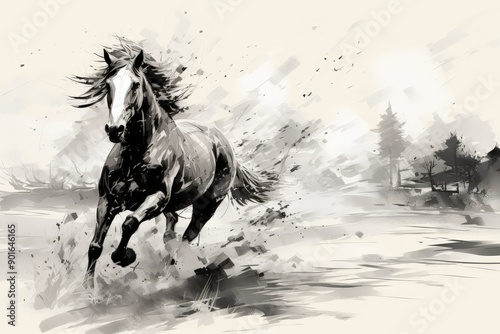 horse, running, black, and, white, landscape, monochrome, galloping, art, animal, wild, nature, speed, motion, energy, powerful, elegant, freedom, paint, illustration, digital, drawing, artistic, brushstroke, vignetting, ink, watercolor, abstract, style, modern, racing, equine, mare, fast horse, mane, tail, forest, mountain, tree, snow, winter, fog, mist, sky, grey