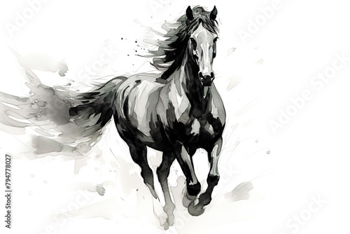 Black horse traditional chinese ink painting on white background. Animals, Illustration, Generative AI.
