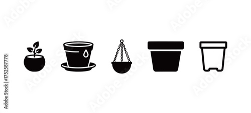 icon, set, black, vector, illustration, gardening, horticulture, planter, flowerpot, germinating, germ bud, chain, hanging, terracotta, plastic, container, home decor, indoor, simple, minimal, flat, isolated, graphic, design, element, nature, growth, care, agriculture, dirtied, drip, water, outline, solid, empty, full