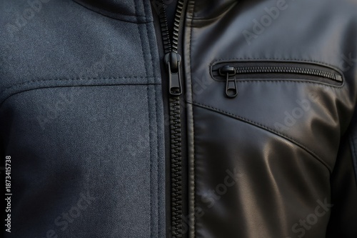 Black jacket showing contrasting faux leather and softshell fabric textures with zippers and precise stitching detail