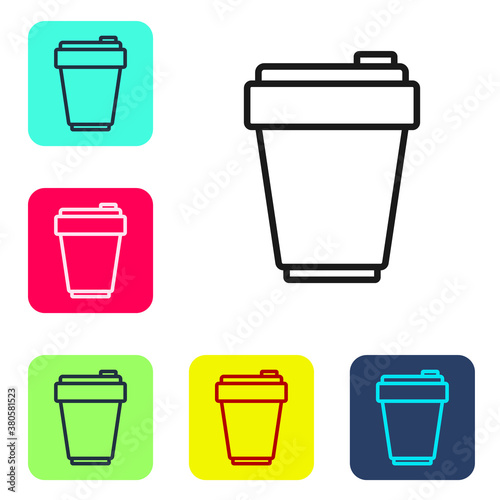 Black line Fitness shaker icon isolated on white background. Sports shaker bottle with lid for water and protein cocktails. Set icons in color square buttons. Vector.