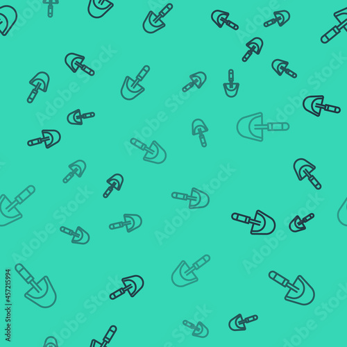 Black line Spatula icon isolated seamless pattern on green background. Kitchen spatula icon. BBQ spatula sign. Barbecue and grill tool. Vector