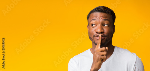signs, mute, positive, gesture, gentleman, t-shirt, adult, guy, copy space, expression, studio, lip, person, concept, free space, advertisement, casual attire, emotion, empty space, african american, photogenic, masculine, confidence, funny, yellow, smiling, bearded, 1, black, finger, banner, people, advertisement, 30s, speak, male, afro, mature, background, man, panorama, hand, hush, privacy, secret, young