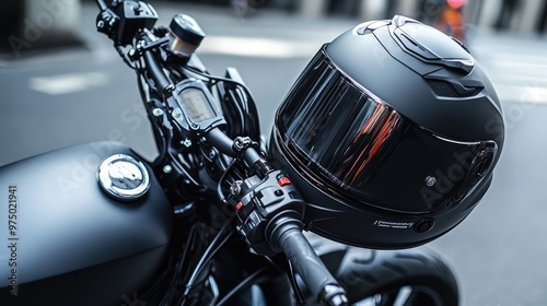 Black Motorcycle Helmet on Handlebars. AI generated illustration