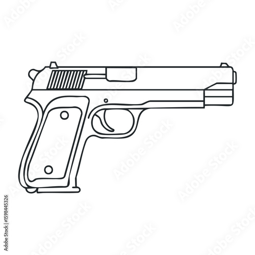 Black outline of a classic handgun pistol on white background for safety education. Vector illustration