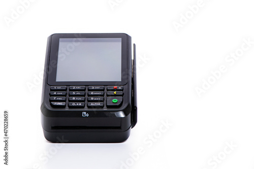 black payment terminal close-up for accepting money from plastic cards from customers on a white isolated background, copy space