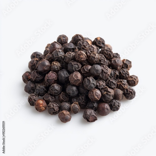 Black pepper spice pile on a white background showcasing texture and color in culinary setting
