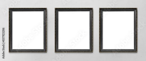 Black picture frame mockups hanging on a gray wall