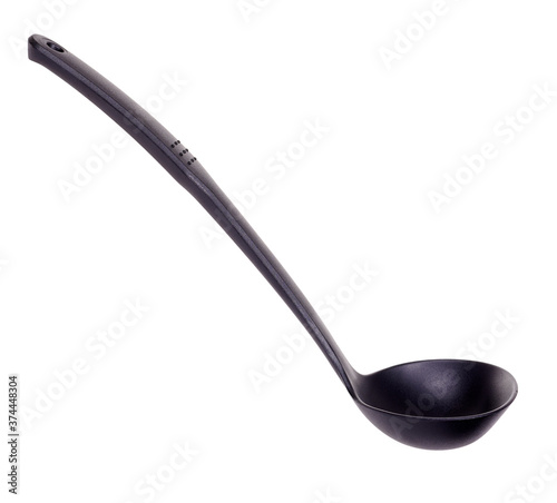 Black plastic ladle, kitchen utensil, isolated on white background.