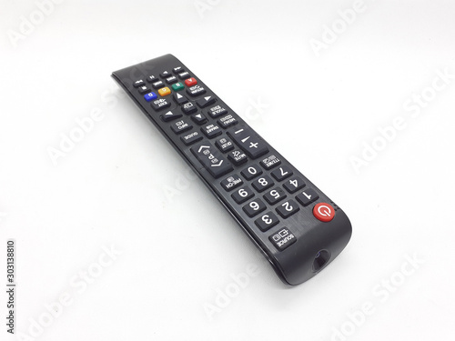 Black Plastic Luxury Modern Wireless Infrared Technology Remote Control of Television Movie Video with Rubber Material Colorful Buttons in White Isolated Background