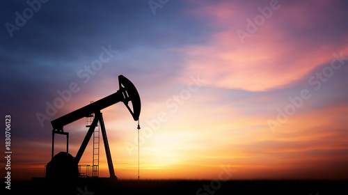 Black pumpjack extraction equipment silhouette against sunset clouds, oil and gas industry machinery, energy production equipment, atmospheric sky backdrop, fossil fuel harvesting,