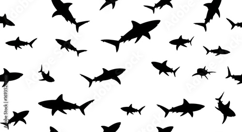 Black Sharks Silhouette on White Background, Underwater Marine Life, Ocean Predator Pattern for Graphic Design and Creative Projects.