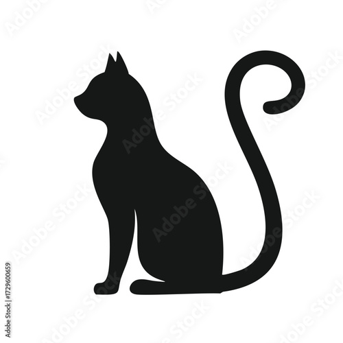 Black silhouette of a cat with a curled tail sitting Keywords: cat, silhouette, black, animal