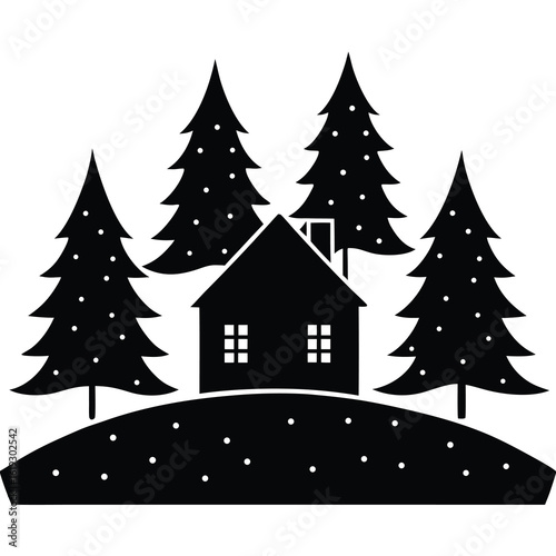 black, white, silhouette, illustration, house, home, cabin, tree, pine tree, evergreen, forest, snow, winter, landscape, nature, rural, country, simple, graphic, design, icon, symbol, isolated, white background, no people, minimal, geometric