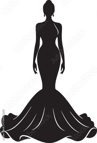 Black silhouette of a woman in a long, flowing mermaid-style evening gown dress