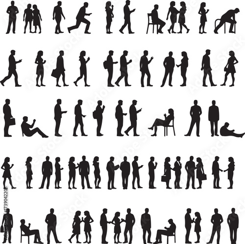 silhouette, people, man, woman, group, standing, walking, sitting, talking, reading, exercising, business, casual attire, diverse, collection, set, icon, figure, human, activity, pose, white background, black, isolated, graphic, vector, illustration, modern, simple, design, male, female, interaction, communication, lifestyle
