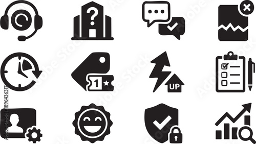 Black Solid Customer Support and Business Performance Icon Set for Help Center, Feedback, Security, Growth and Service Management