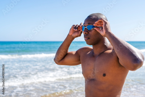 Black swimmer preparing to swim in the sea and putting on swimming goggles by the sea on a sunny day