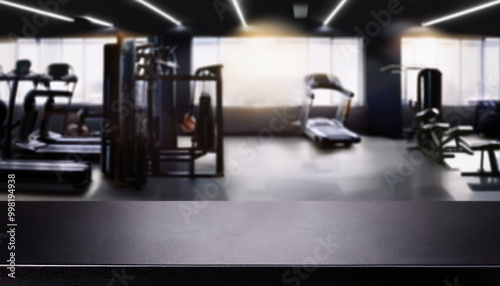 Black table top with gym background for product. Empty countertop mockup for sports nutrition or equipment. the gym