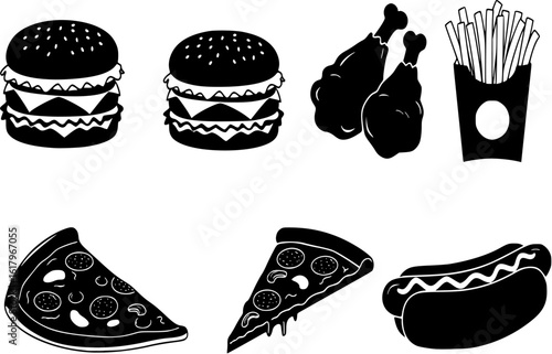 fast food, food, burger, sandwich, french fries, chicken wings, milkshake, drink, black, white, vector, silhouette, illustration, graphic design, icon, set, collection