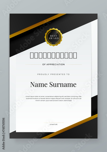 Black white and gold certificate of appreciation border template with luxury badge and modern line and shapes. Certificate of achievement, awards diploma, education, school