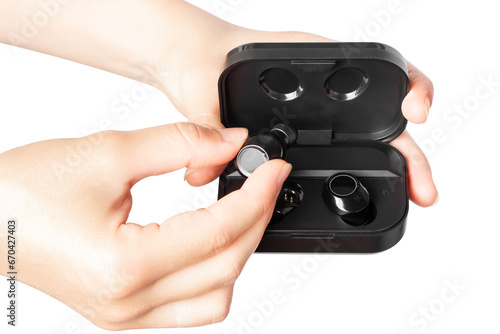 earbud, isolated, isolated on white, white background, cut-out, earphones, audio, portable, cordless, handsfree, compact, wireless technology, audio equipment, black