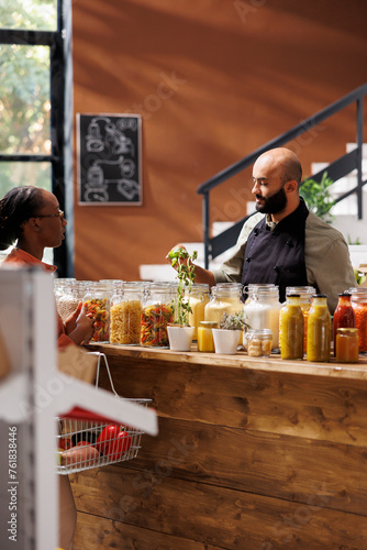 Black woman holding a basket filled with organic food products, in conversation with a male store worker. Male vendor advising african american customer with various sustainable produce.