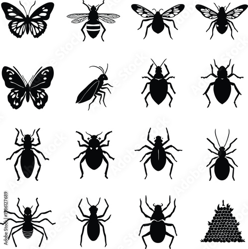 Black-and-White Vector Illustration of Insects & Hive Structure – 16-Item Entomology Silhouette Grid