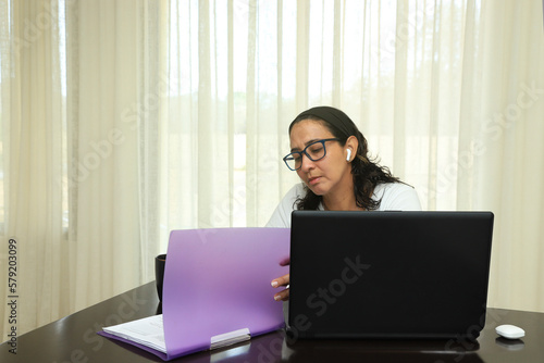 Black-haired woman with glasses and headphones sitting in her living room reviewing her notes and in front of her computer. Caucasian woman sitting in front of her computer working or studying from ho