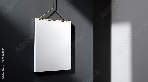 Blank calendar with a clean grid layout outline, simple typography, and subtle texture, hanging on a dark charcoal wall with a smooth finish, illuminated by controlled studio lighting.