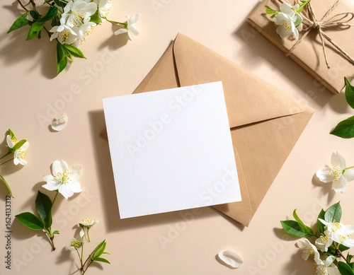 Blank Card and Brown Envelope with Blossom Decoration – Rustic Style Flat Lay